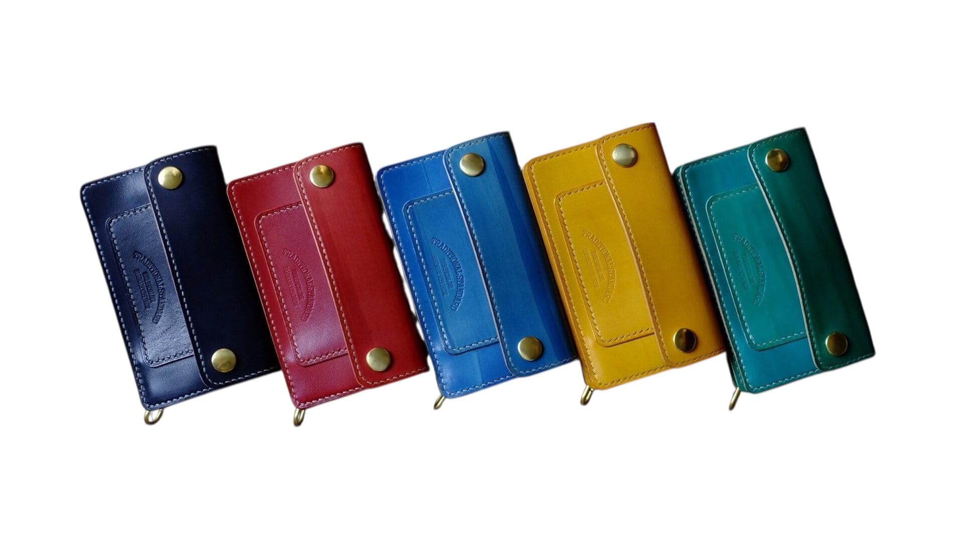 牛ヌメ革手染めのブラック、バーガンディ、モスブルー、イエロー、グリーンの5色
